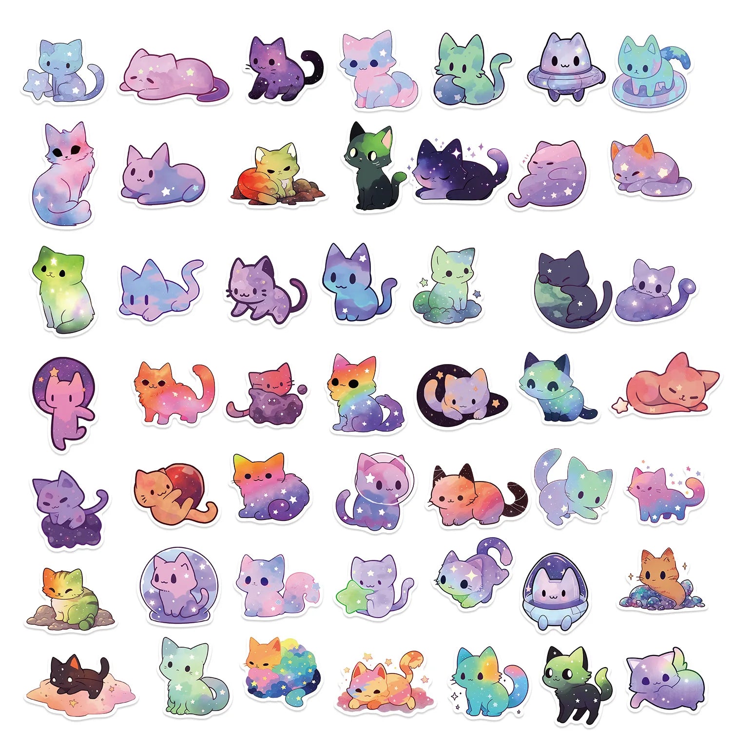 50Pcs Cute Aesthetic Cat Cartoon Rainbow Starry Sky Cat Stickers, Waterproof Stickers for Water Bottle, Laptop, Phone,